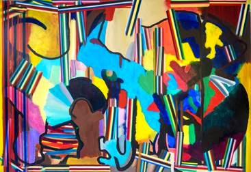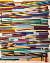 The exhibition begins with a series of large scale abstract paintings from the late 1970s. Multicoloured bands of paint characterise these early works, with more shapes and motifs added as the works evolved in the 80s and 90s. In more recent paintings, from 2007 onwards, the polychrome bars have been replaced by painted lines creating paintings of ever greater complexity.