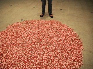 In another gallery room, a huge heap of red and white capsule pills sits in the middle of the floor, every few seconds a new pill falls from the ceiling and adds to the heap. A water fountain next to the pill heap, silently invites the visitor to make another decision. To take a pill or not? If they hadn’t been lying on the floor I might have been tempted.