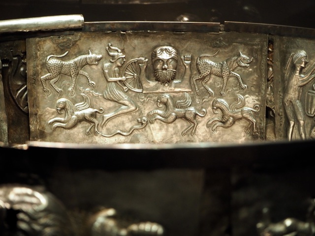 The Gundestrup Cauldron’s decoration is both extraordinary and extremely puzzling. Scenes show gods with their arms held aloft, a woman jumping, other figures wrestling animals, giants upending humans, sea monsters, warriors and animal sacrifices. Quite what these scenes mean is regrettably lost in the passage of time. Do they depict legends or stories or are they of some religious significance? And what was the cauldron used for? We don’t know but regardless these remain powerful images that still fire the imagination more than 2,000 years after they were created. It is a privilege to see it up close.