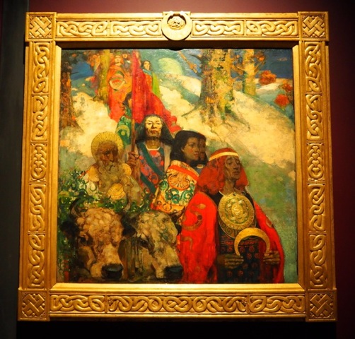 The exhibition goes on to look at the reemergence of the Celtic name in the eighteenth and nineteenth centuries, after it had fallen out of use for hundreds of years. This was a time when writers and artists created a romantic vision of Celticness that reimagined it as the rightful historic past of the Scots, the Irish and the Welsh. This section of the exhibition explores the Bardic traditions of Wales and the National Eisteddfod rites, complete with Archdruid’s robes and regalia on show. The Arts and Crafts movement, the Glasgow School and the Pre-Raphaelite Brotherhood were entranced and inspired by Celtic art and there some beautiful objects from the last decades of the nineteenth century, a glass and silver basin and a stunning enamelled silver triptych amongst them. The painting by George Henry and Edward Atkinson-Hornel The Druids: Bringing in the Mistletoe of 1890 represents late nineteenth century artists’ preoccupation with Celtic subject matter and motifs.