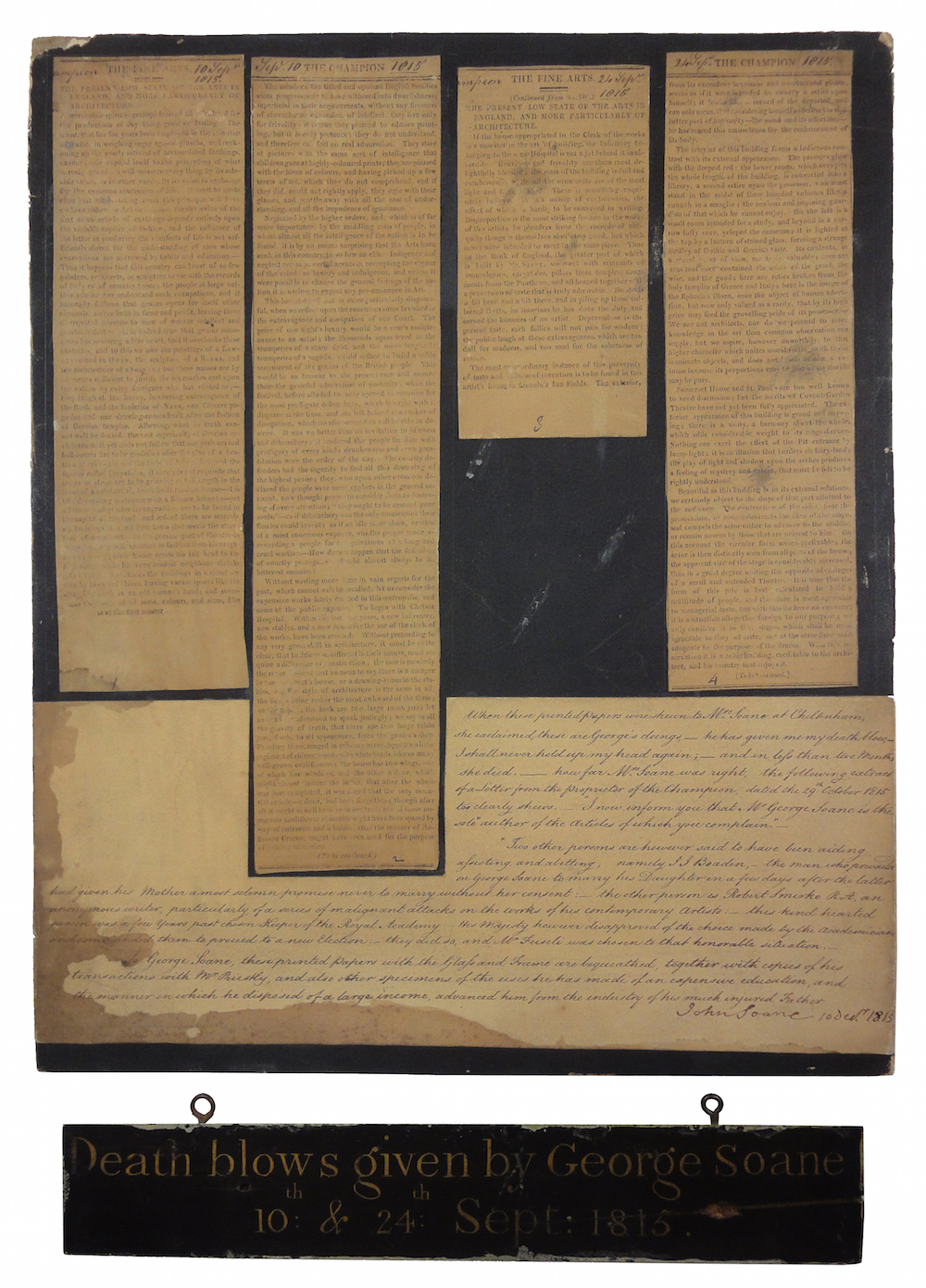 Sir John Soane was devastated and would forevermore blame his son for causing “the death of all that was dear to him.” He had the offending newspaper cuttings mounted on a wooden board, had a title painted for it that reads, Death Blows given by George Soane and had it nailed up in full view in the dining room. The rift was permanent, father and son would never speak again, displaying the sort of grudge-bearing and unwillingness to forgive that would see them all sat down for some family counselling these days.